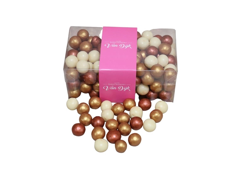 Mooi doosje gevuld met Kerst chocolade crunchy parelmoer parels in verschillende opvallende kleuren.