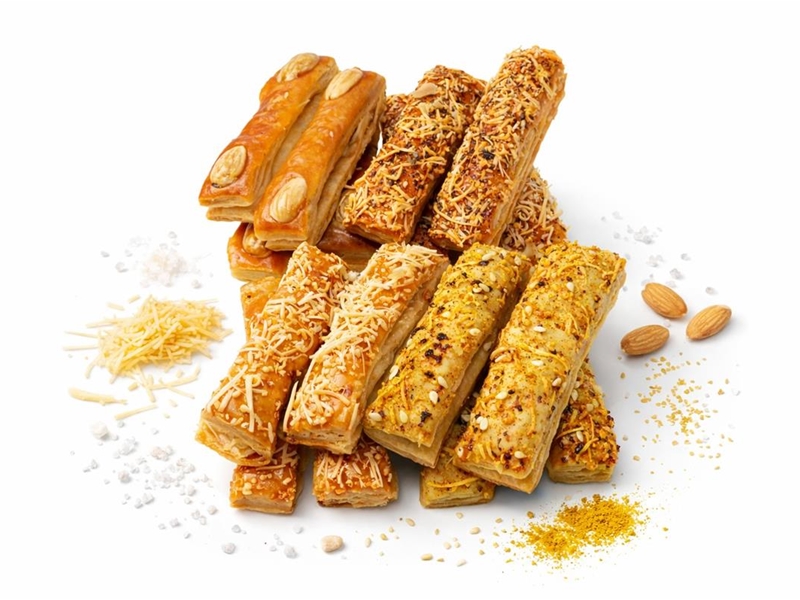 Assortiment zoutjes bestaande uit de volgende smaken: Amandel stengels met zeezout Tomaat/kaas/kruiden stengels Kaasstengels Komijn/kaas/kruidenmix stengels